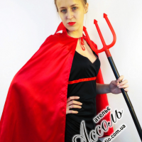 Костюм Чортиця для дорослих - ефектна довга чорна сукня по фігурі та червона накидка з високим коміром. Червоні ріжки та великі вила підсилюють образ Чортиці.