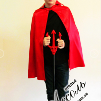 Костюм Чорта для хлопчика - накидка з високим коміром, ріжки на обручі та великі вила. Яскравий червоний колір попереджає про небезпечність Чортика.