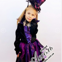 Костюм Відьма для дівчинки - чорна з бузково-фіолетовим декором сукня для святкування Хеловіна. Відьма-модниця у чудових капелюшках - яскраве вирішення образа маленької Відьмочки.