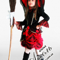 Костюм Відьми для дівчинки - ефектна червона з чорним сукня для святкування Хелловіна. Червоний капелюх з чорною сітчастою вуаллю підсилює образ як маленької Відьмочки, так і Чаклунки.
