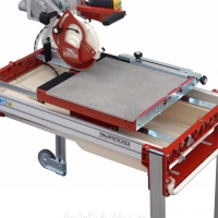 Кращий каменеріз на ринку прокату в Києві. Застосовується для різання по прямій і під кутом, від 0 до 45 градусів керамічної плитки, керамограніта, цегли, мармуру, граніту, тротуарної плитки, цементних блоків та інших будівельних матеріалів. Відсутність люфтів, велика потужність дозволяє точно різати керамограніт, граніт товщиною до 80 мм. Можливість застосування диска 250 мм, а так само можливість встановлення додаткового підтримуючого диска, дозволяє добитися відмінних результатів при знятті фаски під кутом 45 гр. у матеріалах великої товщини і міцності. Для звичайного плиткорізу зняття фаски в важкому керамограніті – дуже важке і практично нездійсненне завдання при товщині більше 10 мм. Зняття торцевого упора дозволяє різати плитку практично будь-якої довжини.