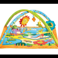 Tiny Love Сонячний день – якісний, м'який та безпечний килимок з розвиваючим аспектом для діток з самого народження, що поставляється з 2 дугами, 4 підвісними іграшками, серед яких музичне сонечко з 3 мелодіями та 25-сантиметровим дзеркалом. Висота арочного склепіння в найвищій точці досягає 45 см. Для звукового супроводу потрібні 3 батареї АА.