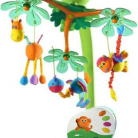три м’які звірятка що висять на гілочках зелені: мавпеня, жирафа та папуга – закртутять малюка у танці, що відволіче крихітку;