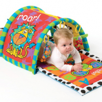 До ігрового комплексу входять три тканинні безпечні іграшки-брязкальця. Іграшки підвішуються до м'яких дуг на пластикових кільцях. На килимку зображення тварин. Іграшки, що висять на арках, стимулюють малюка тягнутися, хапати і стукати по іграшках ручками або ніжками. Цікава та різноманітна структура іграшок допомагає практикуватися у розвитку дрібної моторики рук та тактильному сприйнятті. Малюкові буде дуже цікаво повзти через тунель.