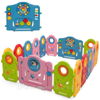 Наш дитячий манеж вкрай необхідний молодим татові і мамі або навіть сім'ї, в якій є ще одна дитина. Цей новий тип дитячого манежу має більш нові форми і більш насичені кольори. Красиві кольори можуть привернути увагу дитини, а розвиваючі іграшки на ігровій дошці допоможуть йому краще вчитися і досліджувати. Ваша дитина буде любити залишатися всередині і грати. Він також може надати вашій дитині безпечне місце для ігор та відпочинку. Нековзна гумова прокладка в нижній частині панелі ускладнює перекидання і переміщення. Замок безпеки знаходиться на зовнішній стороні дверей, щоб дитина не могла відкрити двері і вирватися з паркану.