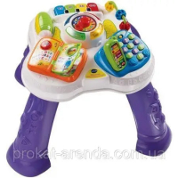 Ідеальною іграшкою для малюка , який вчиться стояти - є музичний столик. Музичний столик являє собою ігрову панель з 4 ігровими зонами для гри. Спираючись на столик дитина вчиться, грає і розвиває дрібну моторику, велику моторику, причинно-наслідкові зв'язки і просто насолоджується музикою. Столик сприяють розвитку пам'яті, зору, слуху. Столик має 2 режими. Перший навчальний, другий музичний. Столик виконаний у яскравих тонах. На столику маля знайде : 1. телефон з яскравими великими кнопками, 2. книжку з кольоровими сторінками, 3. піаніно, яке познайомить дитину з нотами, 4. барабан, який сподобається крутити малюкові, 5. циферблат годинника, з обертовою стрілкою, 6. рахунки-сортер.