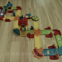 Усі на борт уперед, уперед! Великий Вокзал від VTech. Поїзд чух-чух рухається через станцію під міст, або поверніть ручку, щоб змусити його заїхати на конвеєрну стрічку. Ваш маленький проводник може їздити разом із цим іграшковим поїздом!